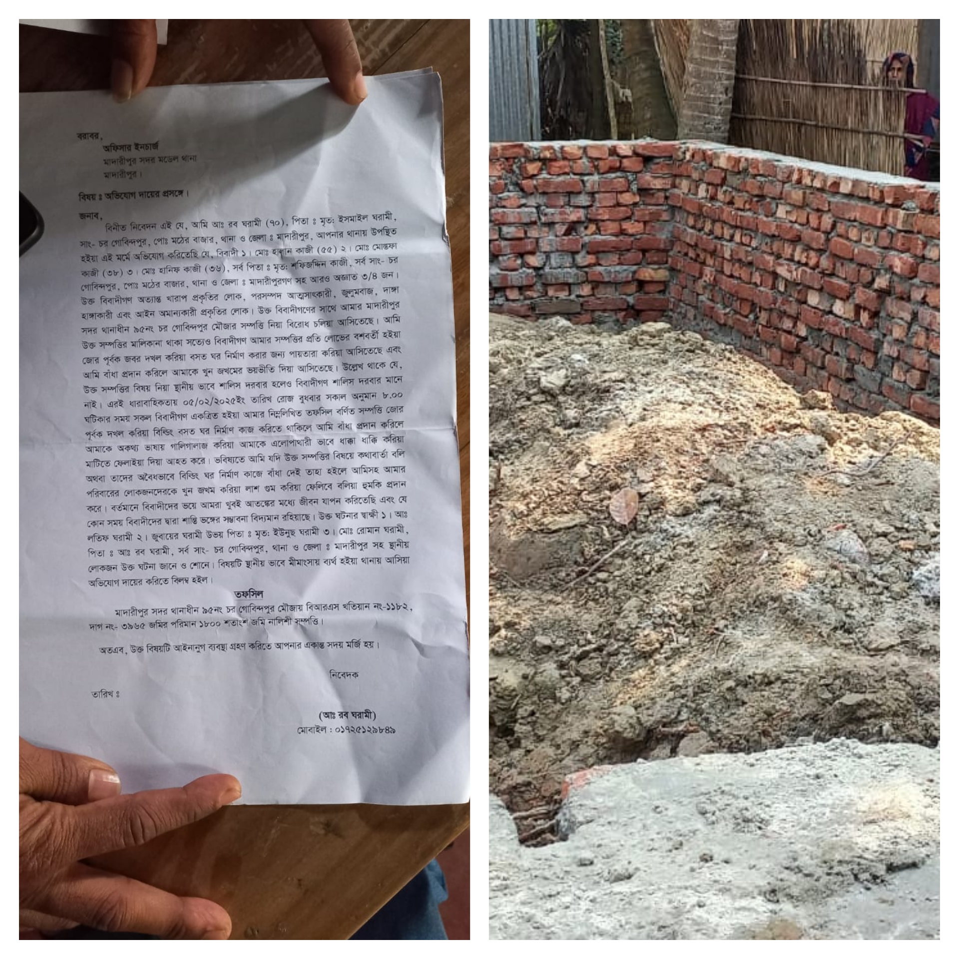 মাদারীপুরে প্রশাসনের আদেশ অমান্য করে স্থানীয় মাতব্বরদের সহযোগিতায় বসত ভিটা জবরদখলের অভিযোগ উঠেছে হালান কাজী ৫৫ মোস্তফা কাজী ৩৮ হানিফ কাজী ৩৬ সর্বপিতা মৃত শফিউদ্দিন কাজী গংয়ের বিরুদ্ধে। সরেজমিনে গিয়ে জানা যায় মাদারীপুরের ৯৫ নং চর গোবিন্দপুর মৌজায় আব্দুর রব ঘরামী পিতা মৃত ইসমাইল ঘরামীর পৈক্তিক বাড়ির ভিটার সম্পত্তি জবর দখল করার চেষ্টা চালায়। তার পরিপ্রেক্ষিতে হালাল কাজী, মোস্তফা কাজী, হানিফ কাজী বহিরাগত ভাড়া করা সন্ত্রাসীদের দিয়ে হুমকি ও ভয় ভিতি দেখালে আব্দুর রব ঘরামি স্থানীয় মাতব্বর ও প্রশাসনের সহযোগিতা নেয়। প্রশাসন উভয় পক্ষকে জমির কাগজ নিয়ে বসার জন্য সময় দেয় এবং সমাধান না হওয়া পর্যন্ত উভয় পক্ষকেই কোন স্থাপনা করতে নিষেধ করে আসলেও প্রশাসনকে বৃদ্ধাঙ্গুল দেখিয়ে গ্রামের মাতব্বরদের ম্যানেজ প্রক্রিয়ার মাধ্যমে স্থাপনার কাজ শুরু করেন। অসহায় পরিবারটি জানায়, আমি আইনের প্রতি শ্রদ্ধাশীল আমি প্রশাসন ও সমাজের বিবেকবান মানুষের মাধ্যমে আমার পৈতৃক ভিটা দখল যেন না হয় এজন্য সকলের সহযোগিতা চাই।